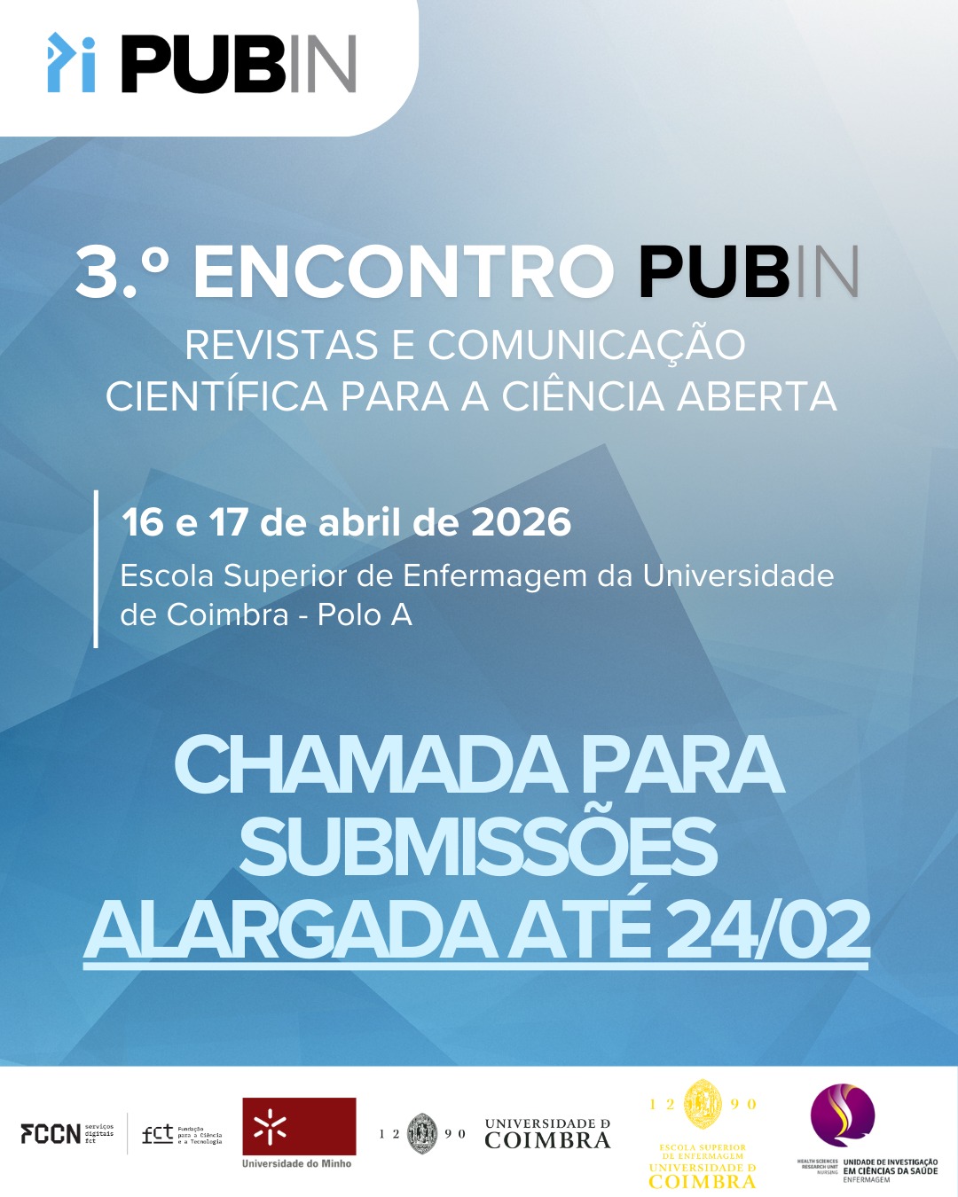 📢 A chamada para submissões do 3.º Encontro PUB IN ficará aberta até 24 de fevereiro! Mais 4 dias para prepararem a vossa proposta.