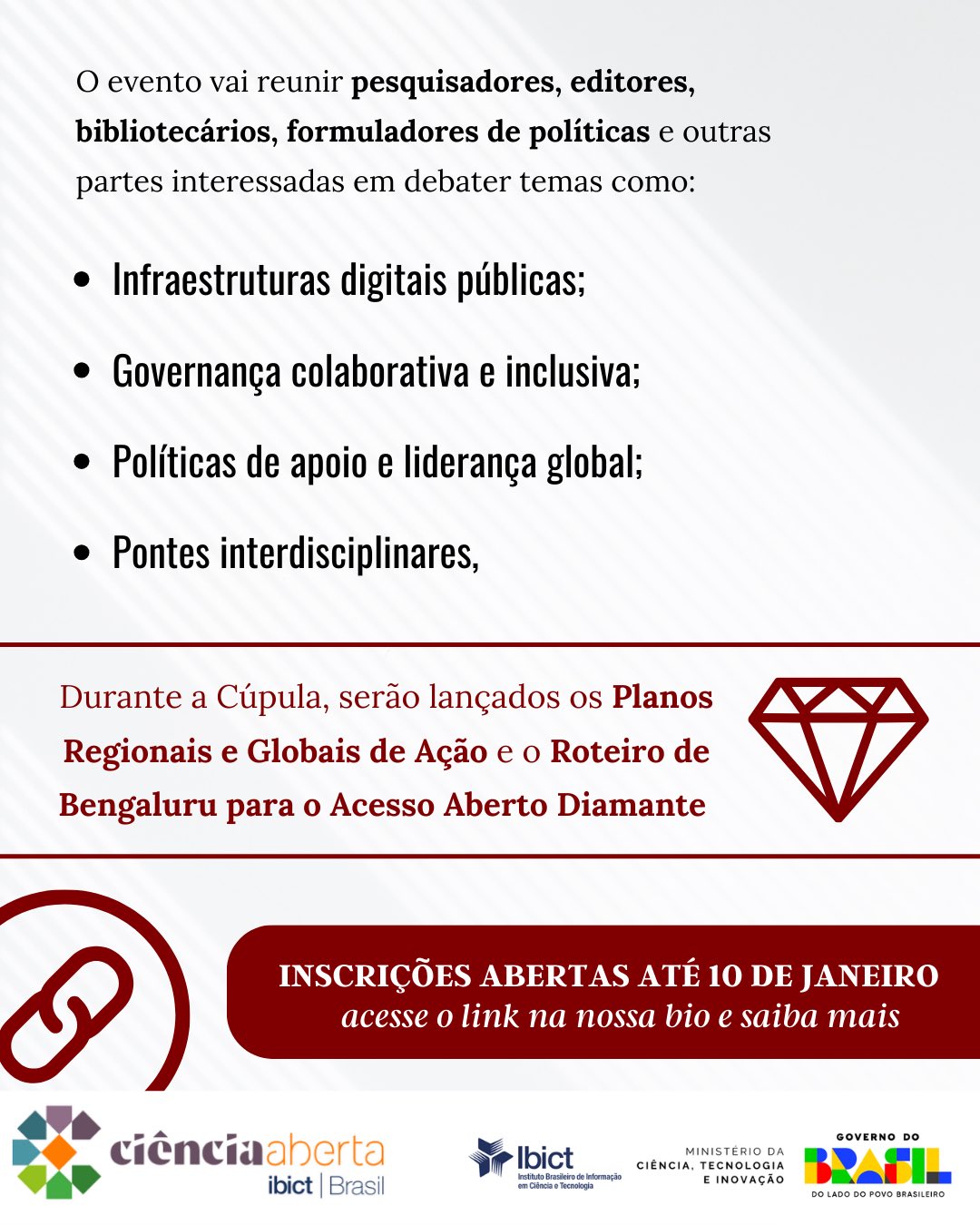 🔎 Por meio de painéis, trilhas temáticas e workshops interativos, a Cúpula vai reunir profissionais como pesquisadores, editores, bibliotecários e formuladores de políticas interessados em promover um sistema de comunicação acadêmica mais equitativo, sustentável e orientado pela comunidade.