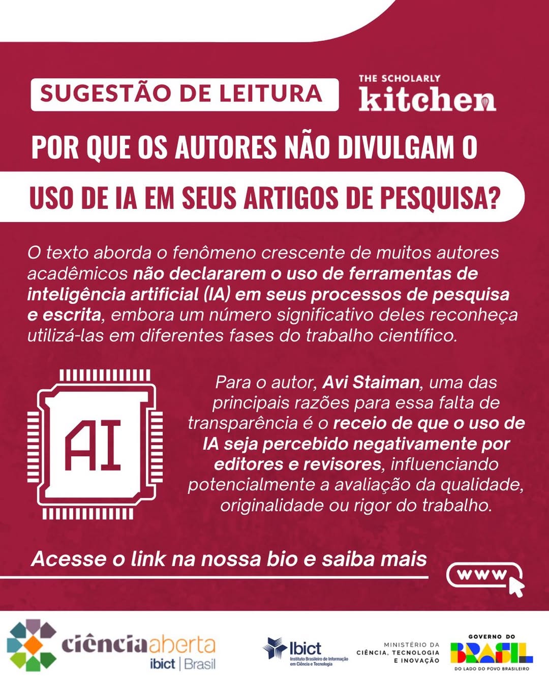 ✍🏼 É esse o tema de um texto escrito pelo autor Avi Staiman e publicado no blog norte-americano The Scholarly Kitchen. A ideia é abordar o fenômeno crescente de muitos autores acadêmicos não declararem o uso de ferramentas de inteligência artificial (IA) em seus processos de pesquisa e escrita, embora um número significativo deles reconheça utilizá-las em diferentes fases do trabalho científico.