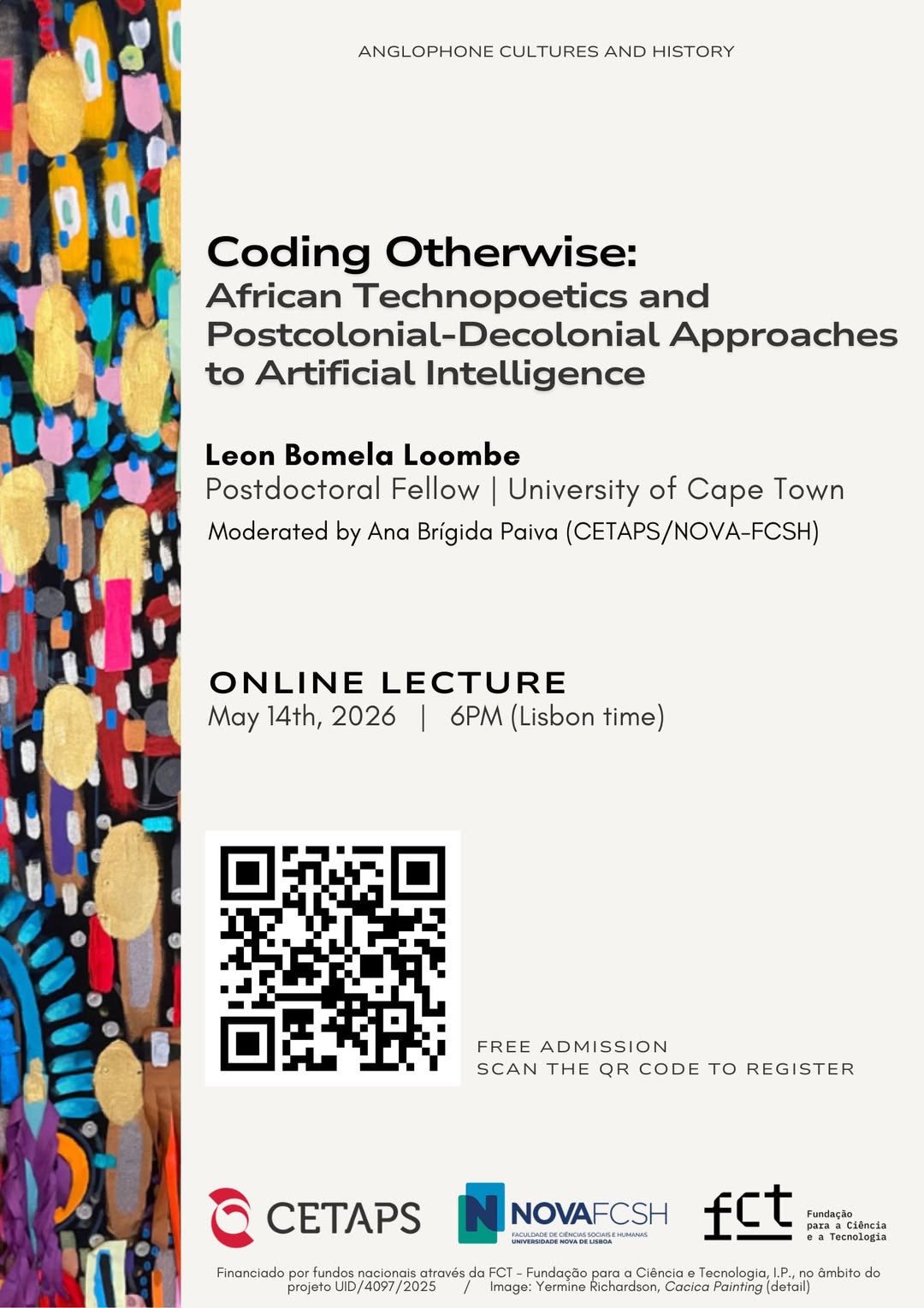 As part of the NOVA-FCSH MA seminar Postcolonial Studies: Literature, Culture and the Arts (and within the CETAPS Research Area Anglophone Cultures and History), we are pleased to welcome Postdoctoral Fellow Leon Bomela Loombe (University of Cape Town) for an online guest lecture titled Coding Otherwise: African Technopoetics and Postcolonial-Decolonial Approaches to Artificial Intelligence, taking place on May 14 th , 2026 at 6PM (Lisbon time) and moderated by Ana Brígida Paiva (CETAPS/NOVA-FCSH).