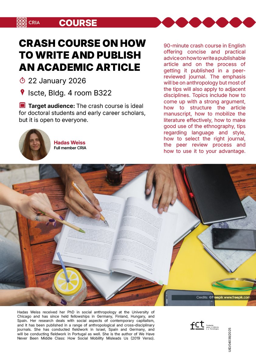 CRIA is pleased to announce the “Crash Course on How to Write and Publish an Academic Article”, a 90-minute intensive course in English led by Hadas Weiss (CRIA).