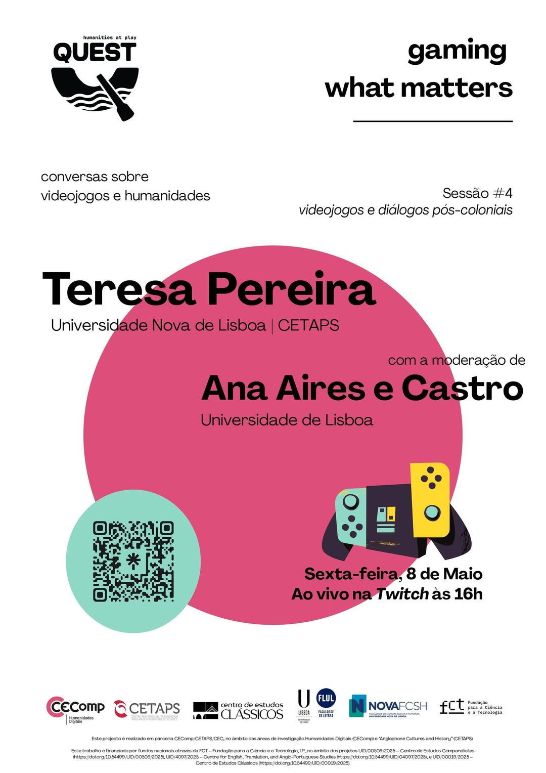 Descrição: O ciclo de palestras online Gaming What Matters, uma iniciativa do projecto Quest: Humanities at Play (CEComp/FLUL/CETAPS/NOVA-FCSH/CEC) pretende promover o envolvimento do público com um leque diversificado de especialistas de diferentes áreas no campo dos Estudos sobre Videojogos e as Humanidades (incluindo investigadores, programadores, artistas, designers, entre outros), explorando o potencial papel destas últimas no emergente mundo digital. As diferentes palestras, orientadas por uma abordagem comparatista que unifica todas as intervenções, tratarão de temáticas diversas, desde questões políticas, sociais e culturais a práticas teóricas e metodológicas, assim como tópicos relacionados com a programação, a ilustração e o design de videojogos, tendo como base pontos de vista centrados nas Humanidades. A quarta sessão contará com a participação da Professora e Investigadora Teresa Pereira (Universidade Nova de Lisboa/CETAPS), que abordará a vasta área dos Estudos Pós-Coloniais em articulação com a análise e investigação sobre videojogos.
